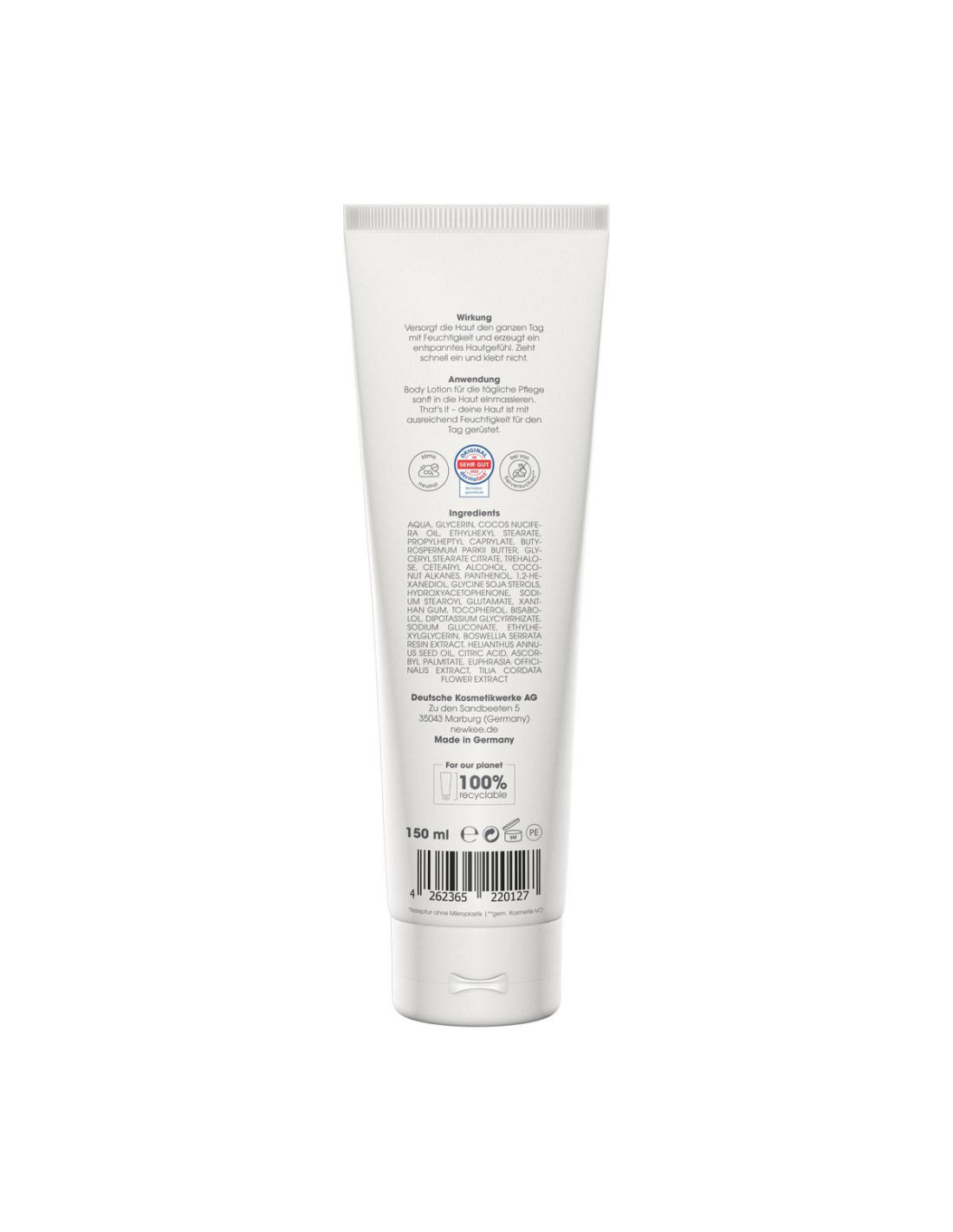 Die newkee Body Lotion Soft ist eine leichte, nachhaltige Pflege für trockene und empfindliche Haut. Kokosöl und Sheabutter spenden intensive Feuchtigkeit und ziehen schnell ein, während Panthenol und Bisabolol die Hautbarriere stärken und vor Flüssigkeitsverlust schützen – auch bei häufigem Duschen. Lindenblüten-, Augentrost-, Süßholz- und Weihrauchextrakte beruhigen die Haut, lindern Rötungen und Spannungsgefühle. Die Lotion ist frei von Duftstoffen, Parabenen und Silikonen.